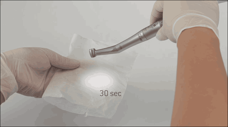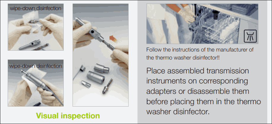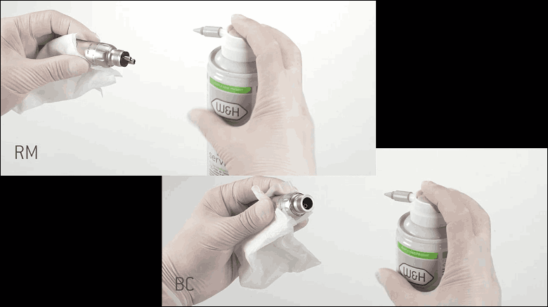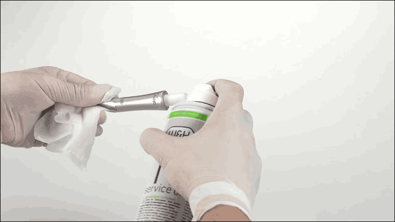 Lưu ý: Tay khoan này nên được làm sạch bằng cách sử dụng chất khử trùng dạng lỏng nhẹ, khăn lau đã được ủ sẵn (trong dung dịch khử trùng) hoặc loại khăn khử khuẩn được bán trên thị trường.  Sử dụng bàn chải đánh răng lông mềm hoặc dụng cụ làm sạch bề mặt (như cọ, chổi) để làm sạch bề mặt bên ngoài của tay cầm, mũi khoan và các bộ phận tháo rời của tay khoan. Để bảo vệ cá nhân, luôn đeo khẩu trang, găng tay và Face Shield trong quá trình làm sạch tay khoan.