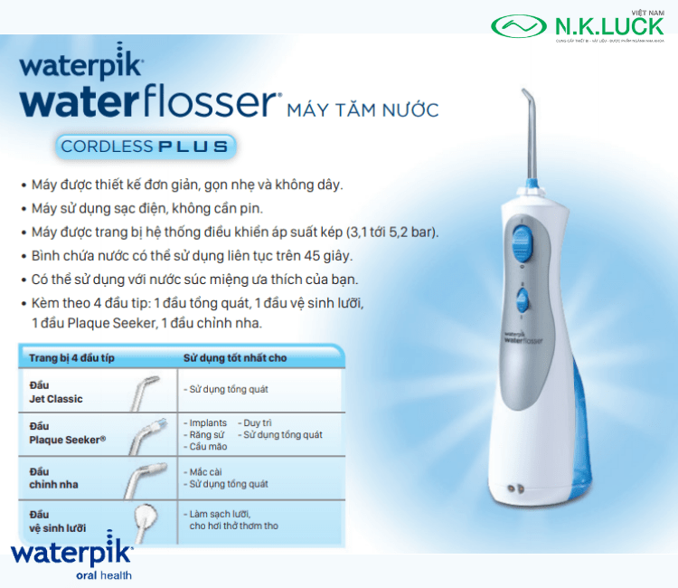 N.K.LUCK là thương hiệu cung cấp các thiết bị nha khoa lâu năm trong ngành (hơn 20 năm) và là đối tác phân phối chính thức của nhiều thương hiệu lớn nổi tiếng thế giới, trong đó có WaterPik.