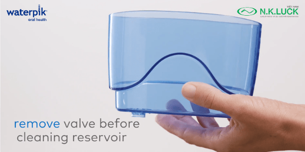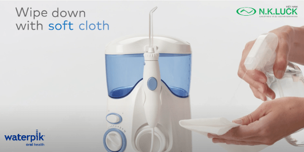 Tháo đầu tay cầm ra khỏi thiết bị bằng nút đẩy rồi ngâm trong dung dịch vệ sinh thiết bị hoặc trong bình chứa 2 phần nước, 1 phần hydrogen peroxide hoặc giấm trắng trong 5 phút. Rửa sạch tay cầm bằng nước ấm. Để đạt được hiệu quả tối đa theo thời gian, N.K.Luck khuyên bạn nên thay đầu tăm Water Flosser mỗi 3 – 6 tháng vì chúng có thể bị tắc hoặc bị ảnh hưởng bởi cặn khoáng tích tụ trong thời gian sử dụng.