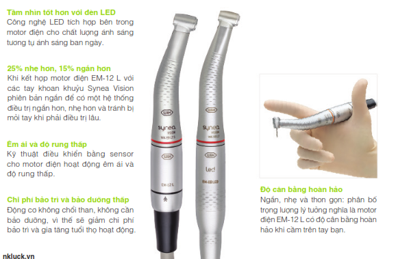 Với sự phát triển không ngừng của động cơ motor trong những năm gần đây, các nhà sản xuất đã thừa nhận rõ ràng rằng trọng lượng và kích thước của tay khoan nha khoa đóng một vai trò quyết định trong quyết định mua hàng. Việc giảm trọng lượng và kích thước là rất rõ ràng so với các tay khoan được sản xuất trong vòng 3 đến 5 năm trở lại đây. Không có gì lạ khi thấy trọng lượng giảm tới 30% và kích thước giảm tới 15%. Sự tiến bộ này là do giảm kích thước khớp nối chuẩn ISO trên động cơ motor. Lưu ý rằng “tay khoan khuỷu phiên bản ngắn” chỉ có thể được sử dụng trên động cơ motor có giảm kích thước ở chuẩn khớp nối E-fitting. Ngay cả với xu hướng giảm trọng lượng chung, tay khoan siêu tốc vẫn nhỏ hơn và nhẹ hơn so với hệ thống tay