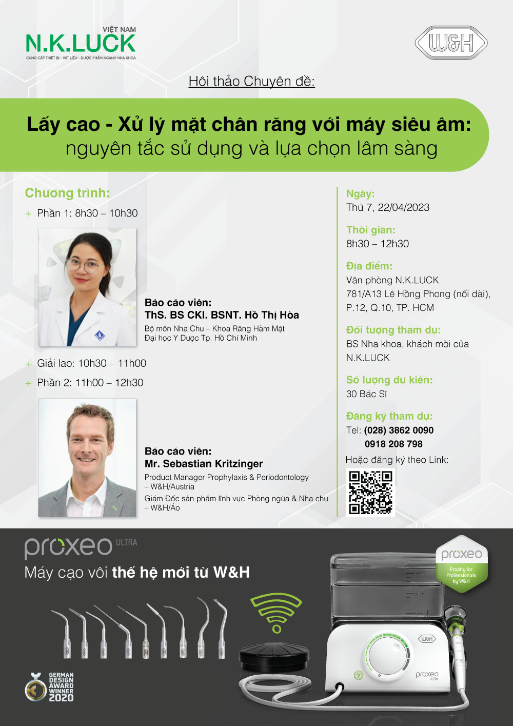 Tháng 04 này N.K.Luck rất vui mừng mời được chuyên gia trong lĩnh vưc Phòng ngừa & Nha chu và chuyên gia đến từ W&H/Áo để chia sẽ kiến thức cũng như thông tin hữu ích và công nghệ mới hỗ trợ BS nhiều hơn trong lĩnh vực điều trị này.