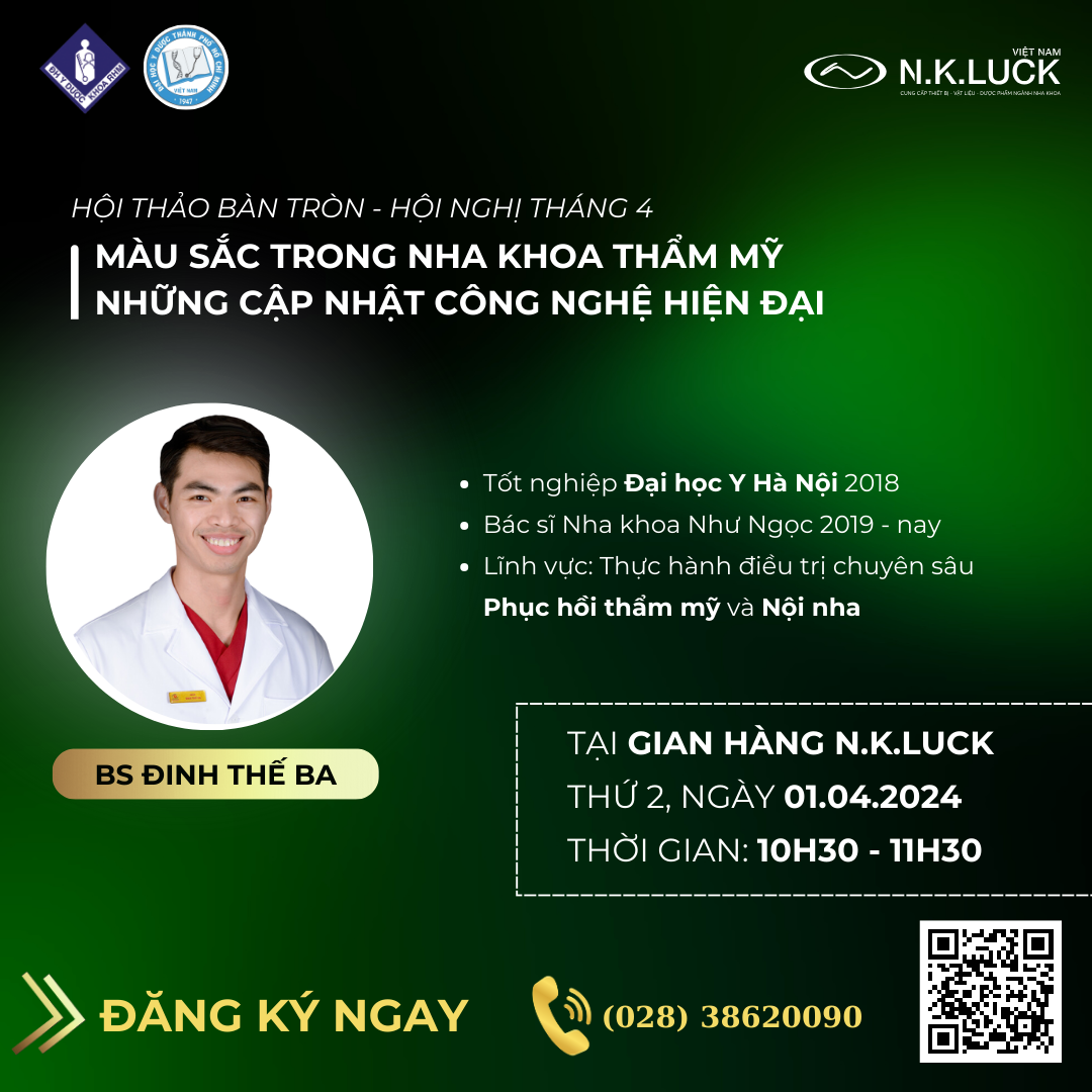 Quý Bác Sĩ/KTV/Khách hàng cùng tham gia tìm hiểu về công nghệ hiện đại trong màu sắc nha khoa và thảo luận chia sẻ với Bs. ĐINH THẾ BA trong đề tài: MÀU SẮC TRONG NHA KHOA THẨM MỸ: NHỮNG CẬP NHẬT CÔNG NGHỆ HIỆN ĐẠI diễn ra tại Hội nghị tháng 4.
