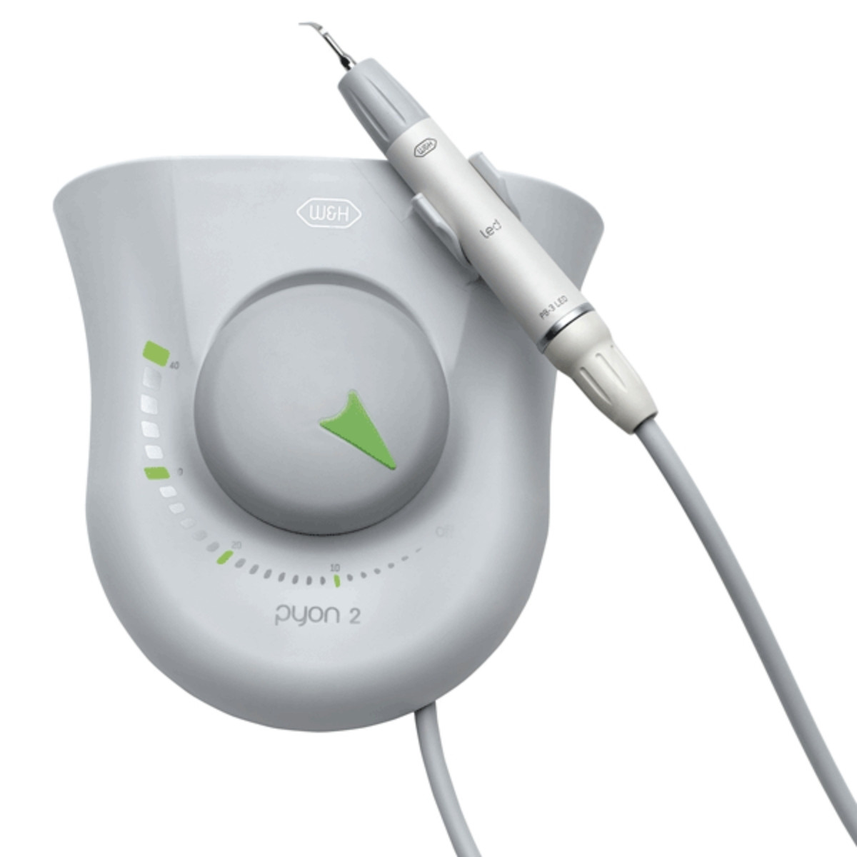 Pyon 2: máy cạo vôi siêu âm ứng dụng trong lĩnh vực cạo vôi, bệnh nha chu, các chuẩn bị phục hình siêu nhỏ. Là dòng sản phẩm hiện đại của W&H, các bạn có thể đạt được những kết quả tốt nhất trong tất cả các ca chữa bệnh. Vòng đèn LED tích hợp trong tay khoan cho phép làm việc xuyên suốt và chính xác. Máy cạo vôi siêu âm này không chỉ giúp mở đường vào ống tủy răng mà còn giúp chúng ta lấy chính xác từng milimet các mảng vôi răng bám chắc vào phần dưới nướu răng. Các loại mũi đa dạng đặc biệt phù hợp từng ứng dụng riêng .