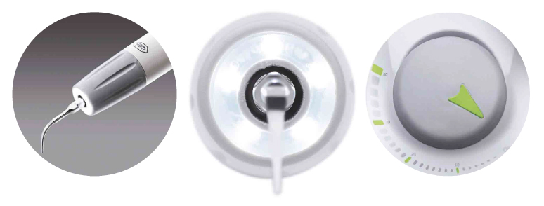 Nhờ vào hệ thống điều khiển dễ dàng, chúng ta có thể điều chỉnh cường độ rung của Pyon 2 một cách chính xác tương ứng với trường hợp điều trị và tương ứng với loại mũi sử dụng như: lấy cao răng phòng ngừa, điều trị nội nha, viêm nha chu hoặc điều trị sâu răng.